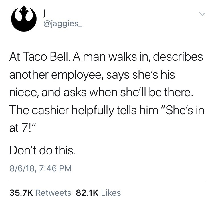 At my last job someone came up and asked when “Sarah” was working next. I didn’t tell him and then texted her a description, turns out he was an abusive ex who had been stalking her. Don’t do this shit please.