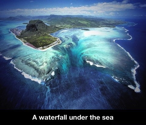 This is off the Island of Mauritius in the Indian Ocean! And actually it’s not really a waterfall, it’s the underwater sediment/minerals and sand that is being swept off the continental shelf into the epipelagic waters by some pretty strong currents, creating a sort of illusion that the water itself is rushing over into a waterfall. It’s a pretty cool illusion though!