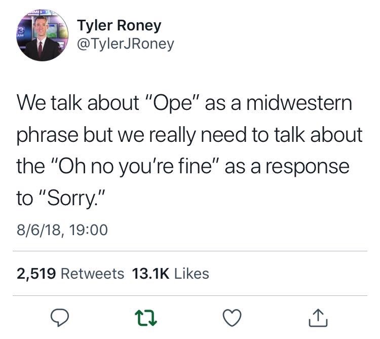 Nobody asked me what I was sorry for. It was just kind of assumed that I was sorry for existing, and if that isn’t the most midwestern thing I’ve ever heard of, I don’t know what is.