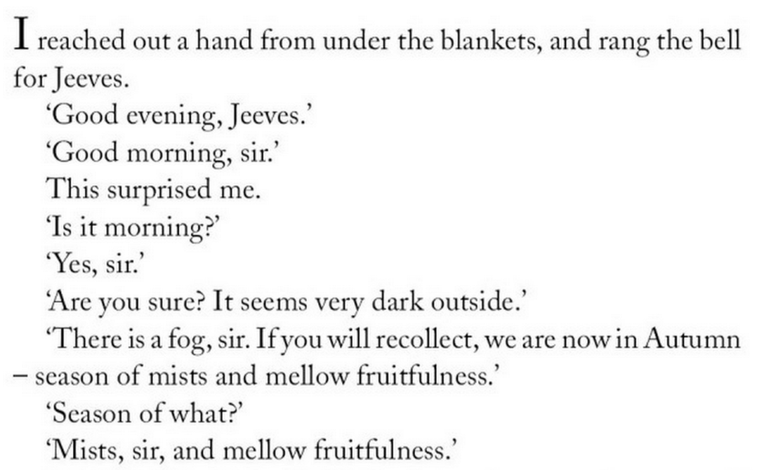 glubglubshrg Uncategorized September 30, 2018December 6, 2018 1 Minute ragpicker-and-poet: – PG Wodehouse, The Code of the Woosters Happy autumn, everyone. Share this: Share on X (Opens in new window) X Share on Facebook (Opens in new window) Facebook Like Loading... Related Published by glubglubshrg View all posts by glubglubshrg Published September 30, 2018December 6, 2018
