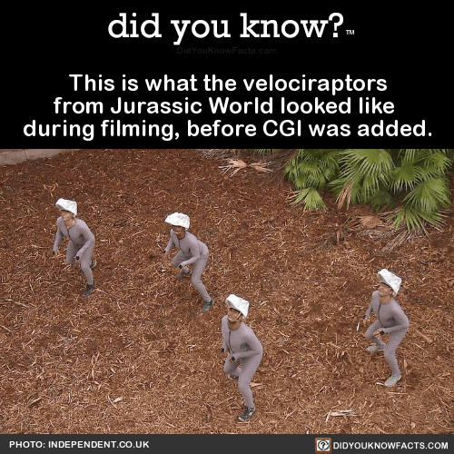 glubglubshrg Uncategorized October 9, 2018December 6, 2018 1 Minute did-you-kno: This is what the velociraptors from Jurassic World looked like during filming, before CGI was added. Source Share this: Share on X (Opens in new window) X Share on Facebook (Opens in new window) Facebook Like Loading... Related Published by glubglubshrg View all posts by glubglubshrg Published October 9, 2018December 6, 2018