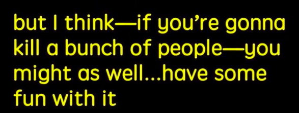 you know what? fuck it, man. the world is held in the fists of people who like to break things. at this point i’m saying who gives a shit. wear that victorian dress you don’t have an excuse for. dress up like a witch, pointed hat and all. who cares anymore. why worry about it when there’s bigger stuff to worry on. i’m saying. yeah, this lipstick is too dark, wanna share? i’m saying go talk to her, tell her that you like her hair. i’m saying she’s out of my league but i’m still swinging, i’m saying yeah i’m in a ballgown and it’s a pta meeting. what about it. eat the extra brownie, tell her your feelings. i’m saying if nothing matters than we might as well give nothing meaning.